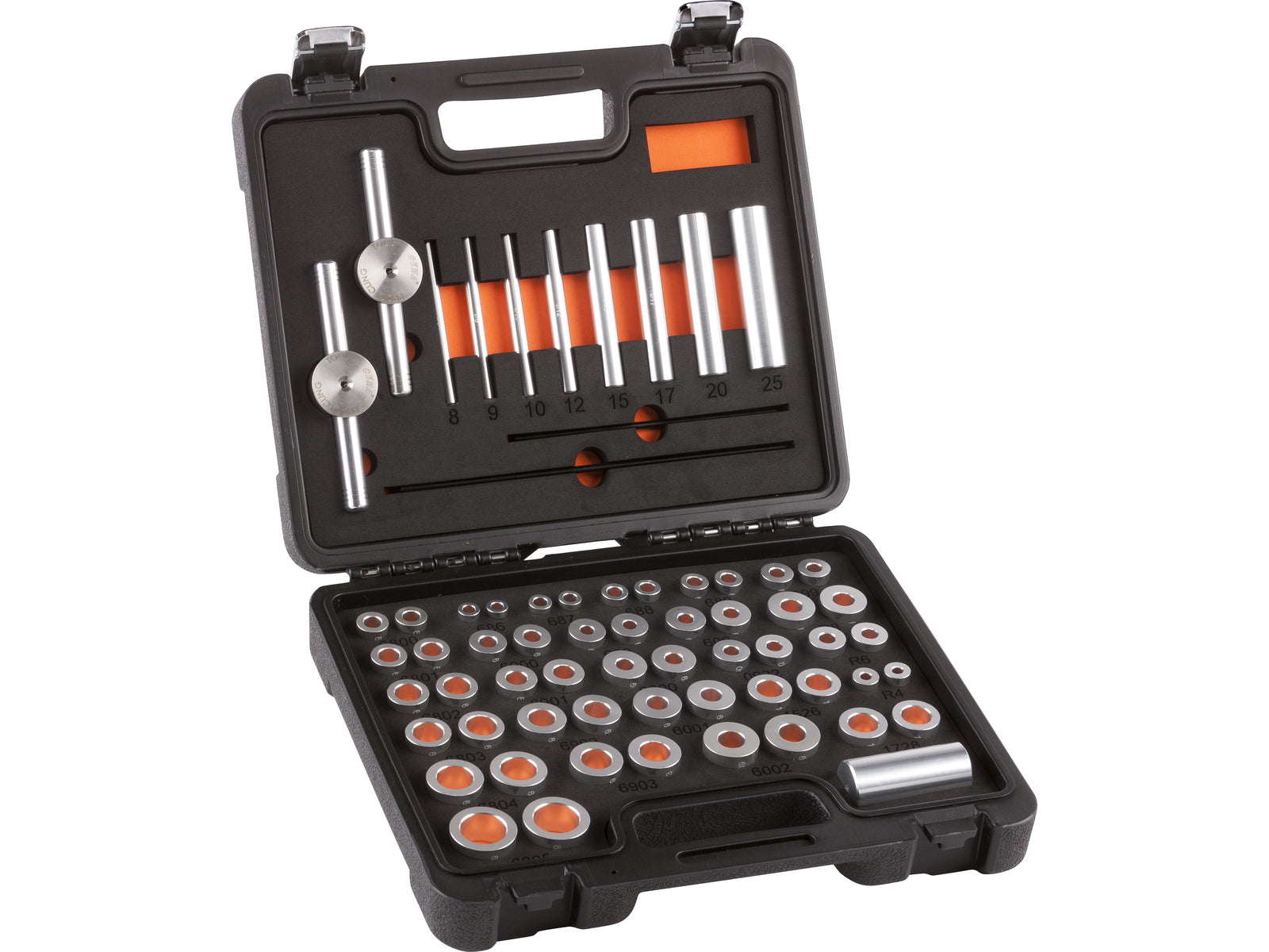 Professional box with installation tools for hub bearings - Box includes guiding pins for the following hub bearings: 6000, 6001, 6002, 6800, 6801, 6802, 6803, 6804, 6805, 6900, 6901, 6902, 6903, 608, 609, 686, 687, 688, 689, 699, R4, R6, R8, 0922, 1526, 1728 and 8, 9, 10, 12, 15, 17, 20 and 25 mm